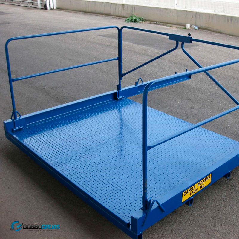 Plataformas metálicas para carga e descarga de materiais para grua, que facilitam o trabalho de operários na obra, evitando esforços desnecessários e minimizando o risco de acidentes devido a configuração dos trilhos e parapeitos de segurança. Ideal para o descarregamento de pallets em diversos materiais tais como blocos, tijolos, cimento, placas de gesso, argamassa. Pode também ser utilizado como um complemento para o deslocamento da ferramenta, uma vez terminado o trabalho, ou durante o processo de limpeza da planta.